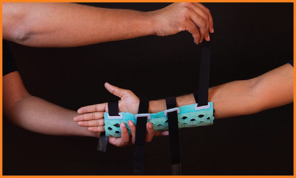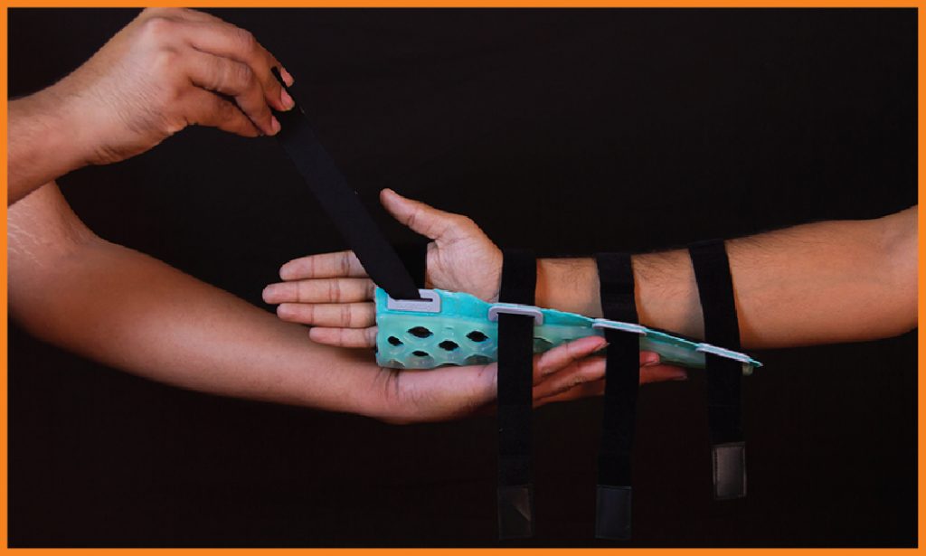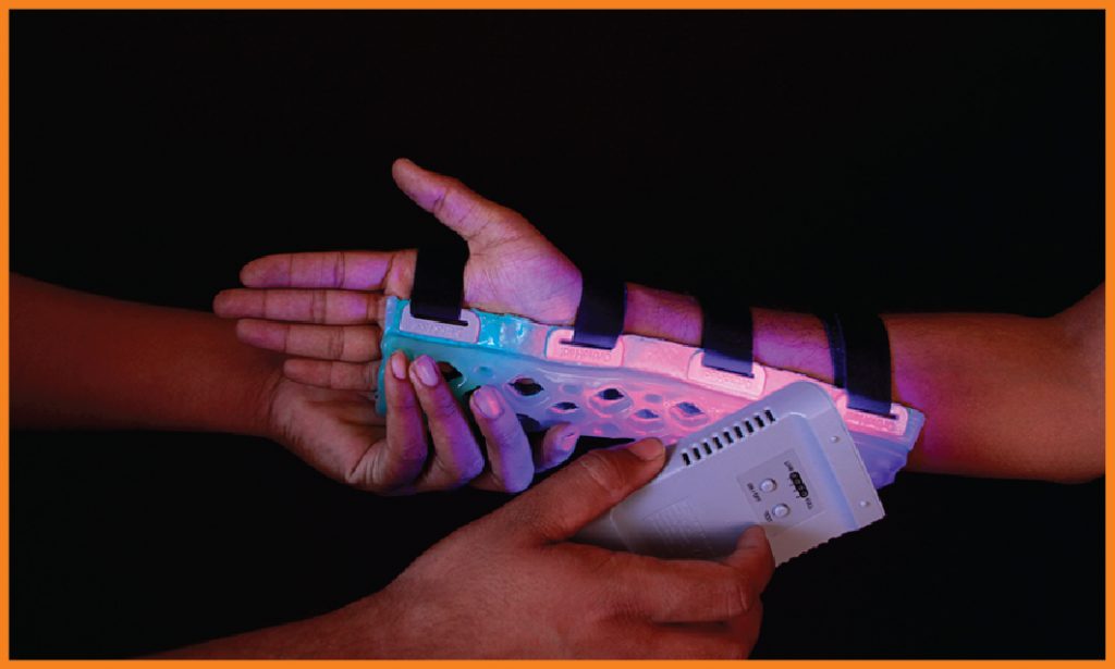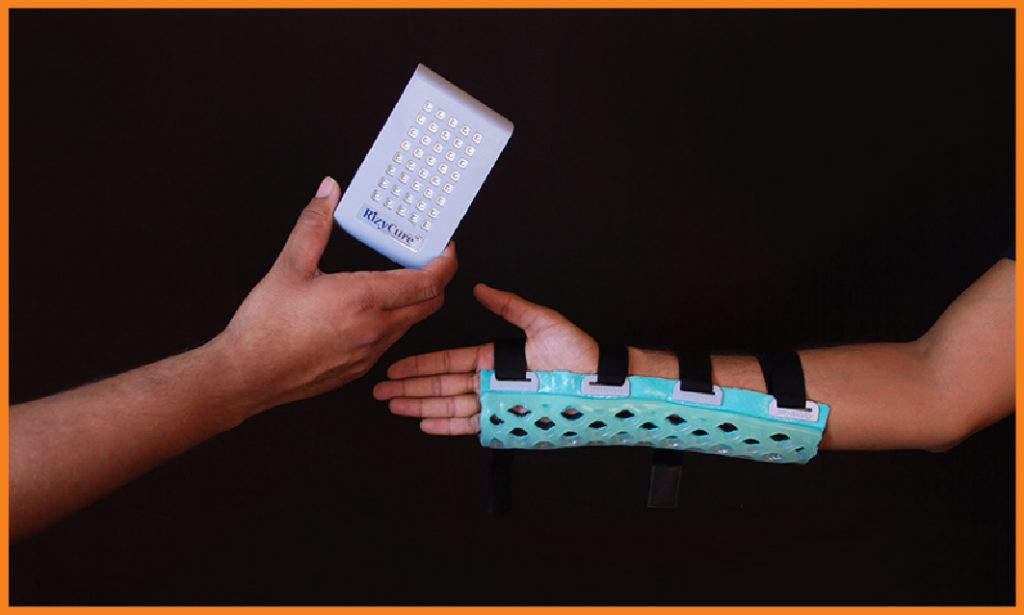FlexiOH® Splints / Slabs are designed for immobilization in the pre-operative, post-operative, acute swelling and rehabilitation period. FlexiOH® has an built-in soft hook and loop fastener that secures the splint over the limb which is very comfortable for skin contact. With unique FlexiOH® technology, this splint gives better patient comfort along with breathability and washability. For application of FlexiOH® Splint / Slab, healthcare professional need to apply it on the patient’s limb with the soft hook and loop fastener and then cure it with the Rizycure® light device (recommended) for 3-10 minutes depending on the size of splint/ slab. Once it is rigid, it will provide support during rehabilitation. With valcro, the splint can be removed / adjusted anytime for dressing and rehabilitation.