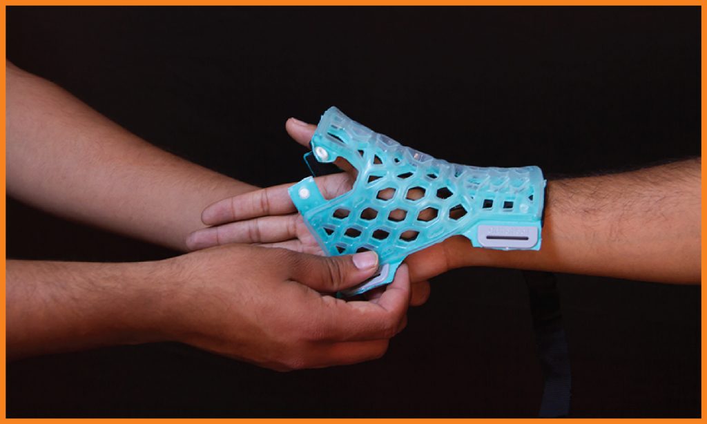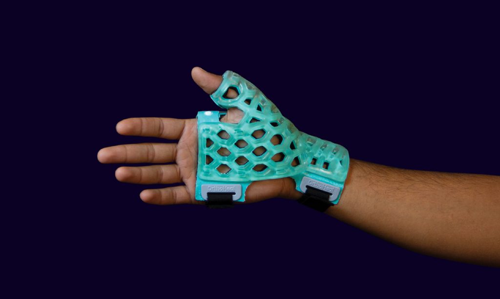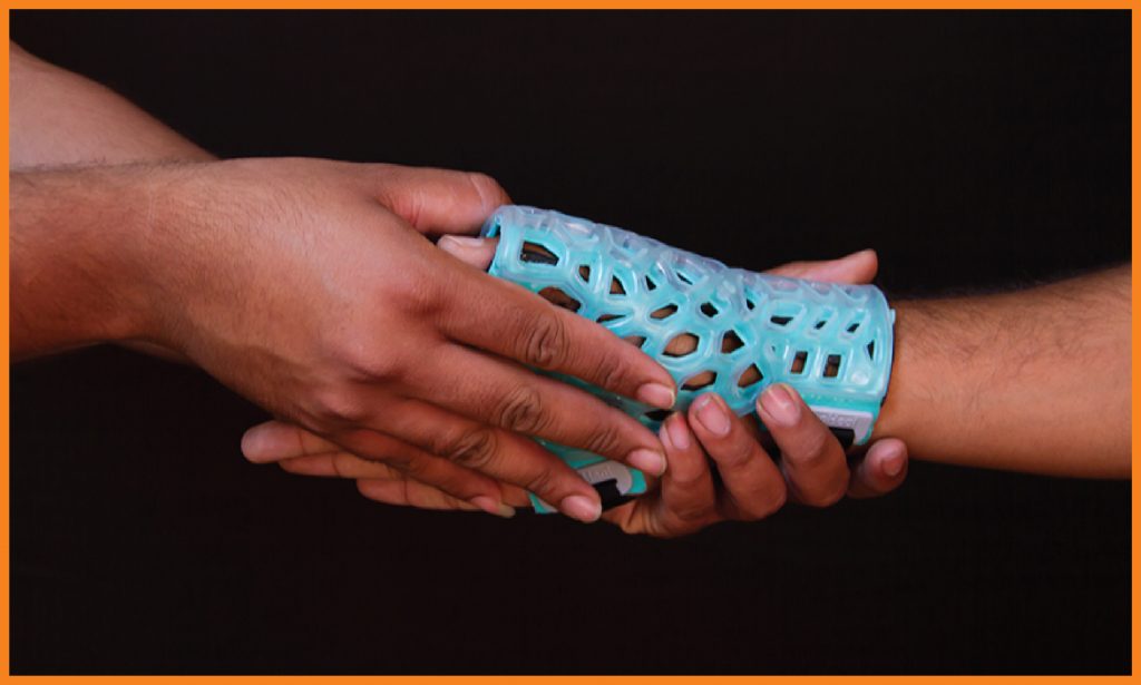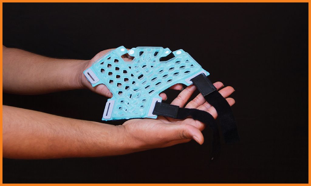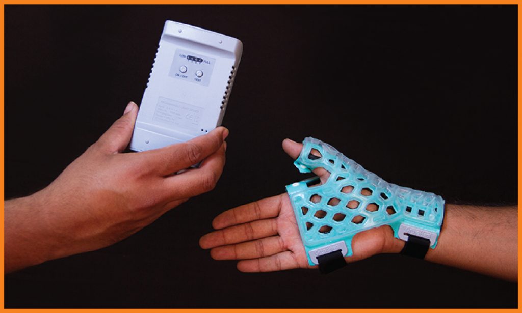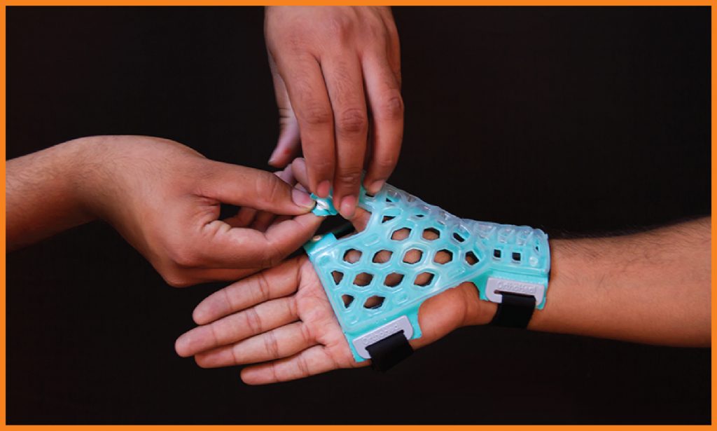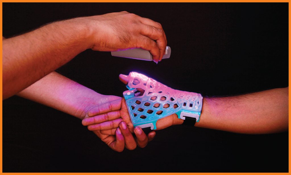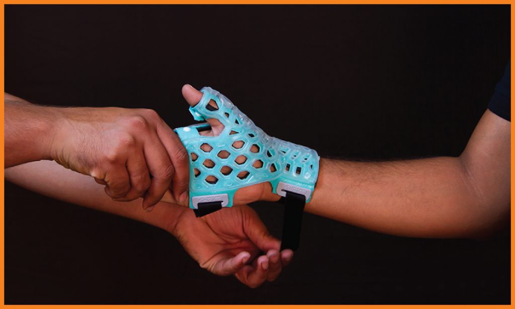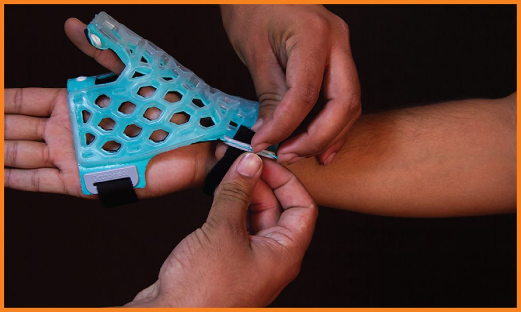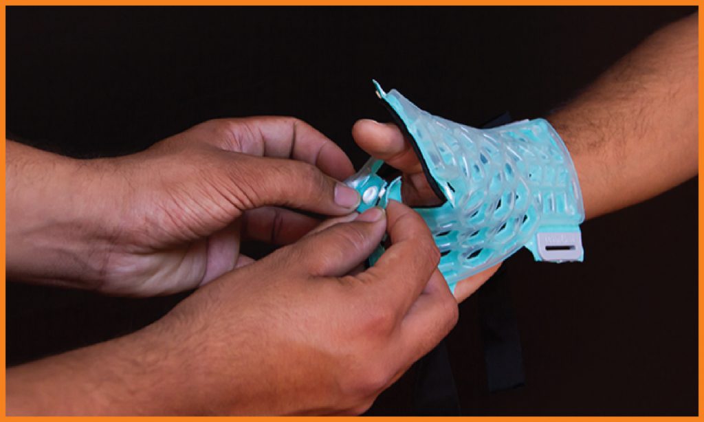 FlexiOH® Thumb Spica immobilizers are designed for immobilization of thumb. It has an inbuilt soft hook and loop fastener which is very comfortable for skin contact. It is used to provide support for thumb injuries (ligament instability, sprain or muscle strain), gamekeeper’s thumb, De Quervain’s syndrome or fractures of the Scaphoid or first metacarpal. Doctors need to apply it on the patient’s hand and then cure it with the RizyCure® light device (recommended) or direct sunlight for around 3-5 minutes depending on the size of immobilizer, until it gets rigid.